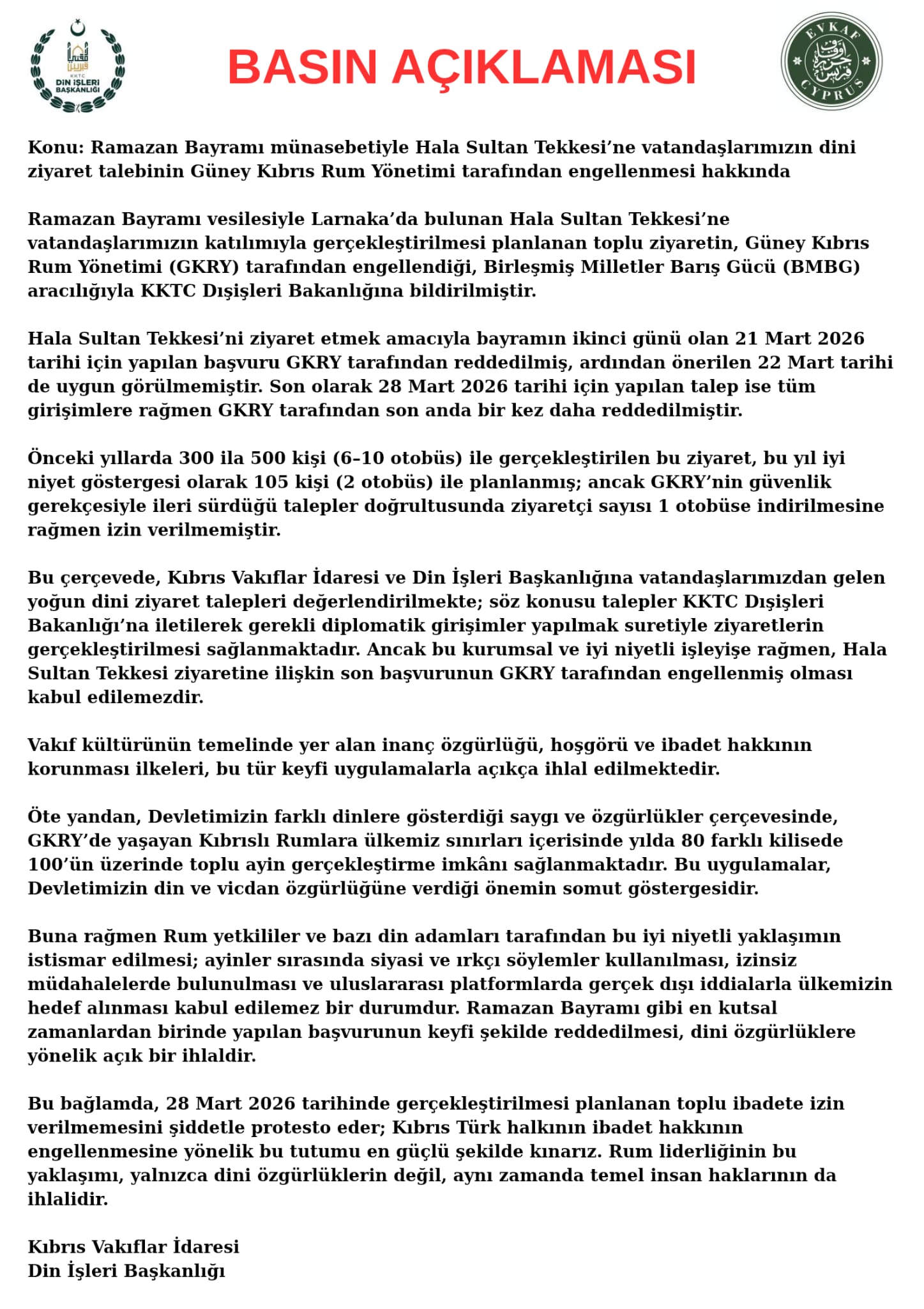 Konu: Ramazan Bayramı münasebetiyle Hala Sultan Tekkesi’ne vatandaşlarımızın dini ziyaret talebinin Güney Kıbrıs Rum Yönetimi tarafından engellenmesi hakkında Ramazan Bayramı vesilesiyle Larnaka’da bulunan Hala Sultan Tekkesi’ne vatandaşlarımızın katılımıyla gerçekleştirilmesi planlanan toplu ziyaretin, Güney Kıbrıs Rum Yönetimi (GKRY) tarafından engellendiği, Birleşmiş Milletler Barış Gücü (BMBG) aracılığıyla KKTC Dışişleri Bakanlığına bildirilmiştir. Hala Sultan Tekkesi’ni ziyaret etmek amacıyla bayramın ikinci günü olan 21 Mart 2026 tarihi için yapılan başvuru GKRY tarafından reddedilmiş, ardından önerilen 22 Mart tarih...